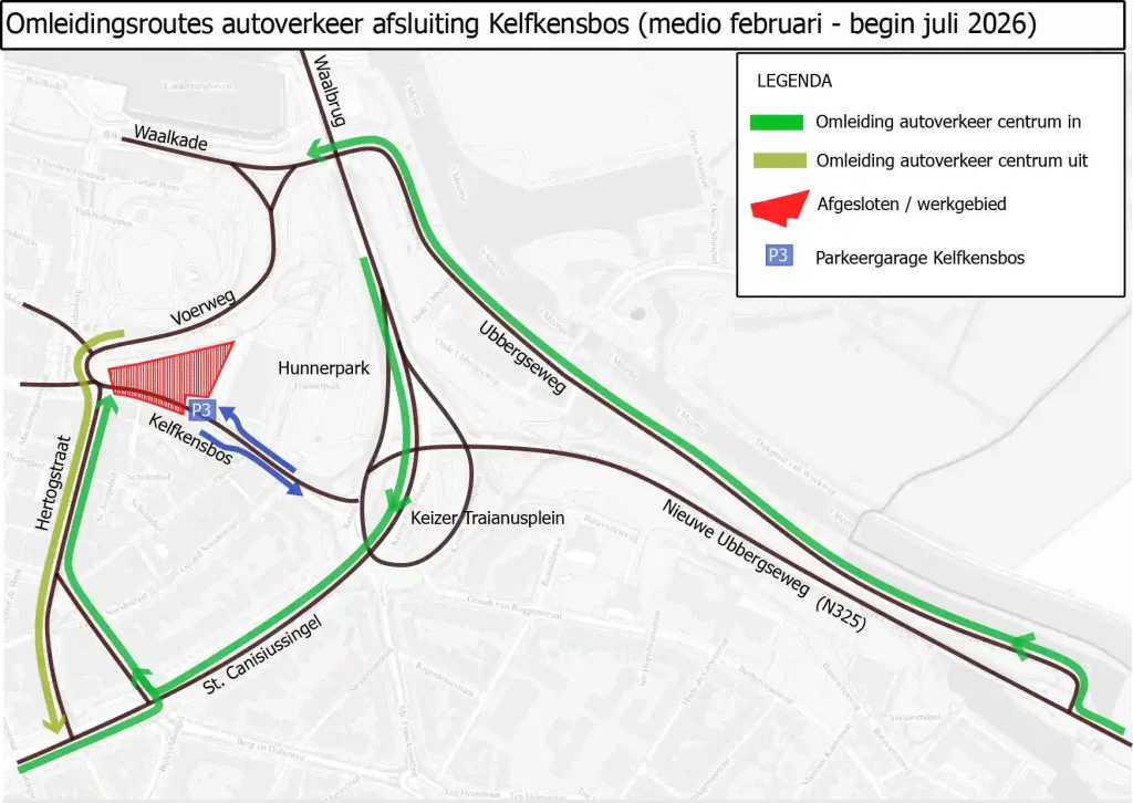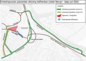 Omleidingsroutes autoverkeer afsluiting Kelfkensbos (medio februari – begin juli 2026).